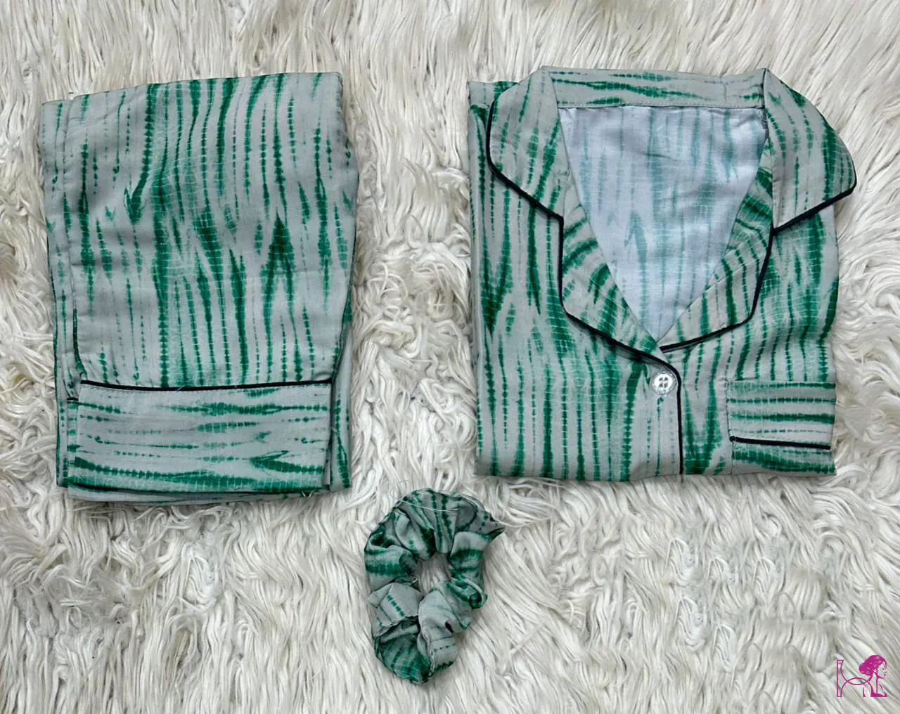 The lined-green pattern adds a fresh, youthful touch without being overly loud. And the scrunchie? It’s both cute and useful—perfect for tying up hair on warm evenings.